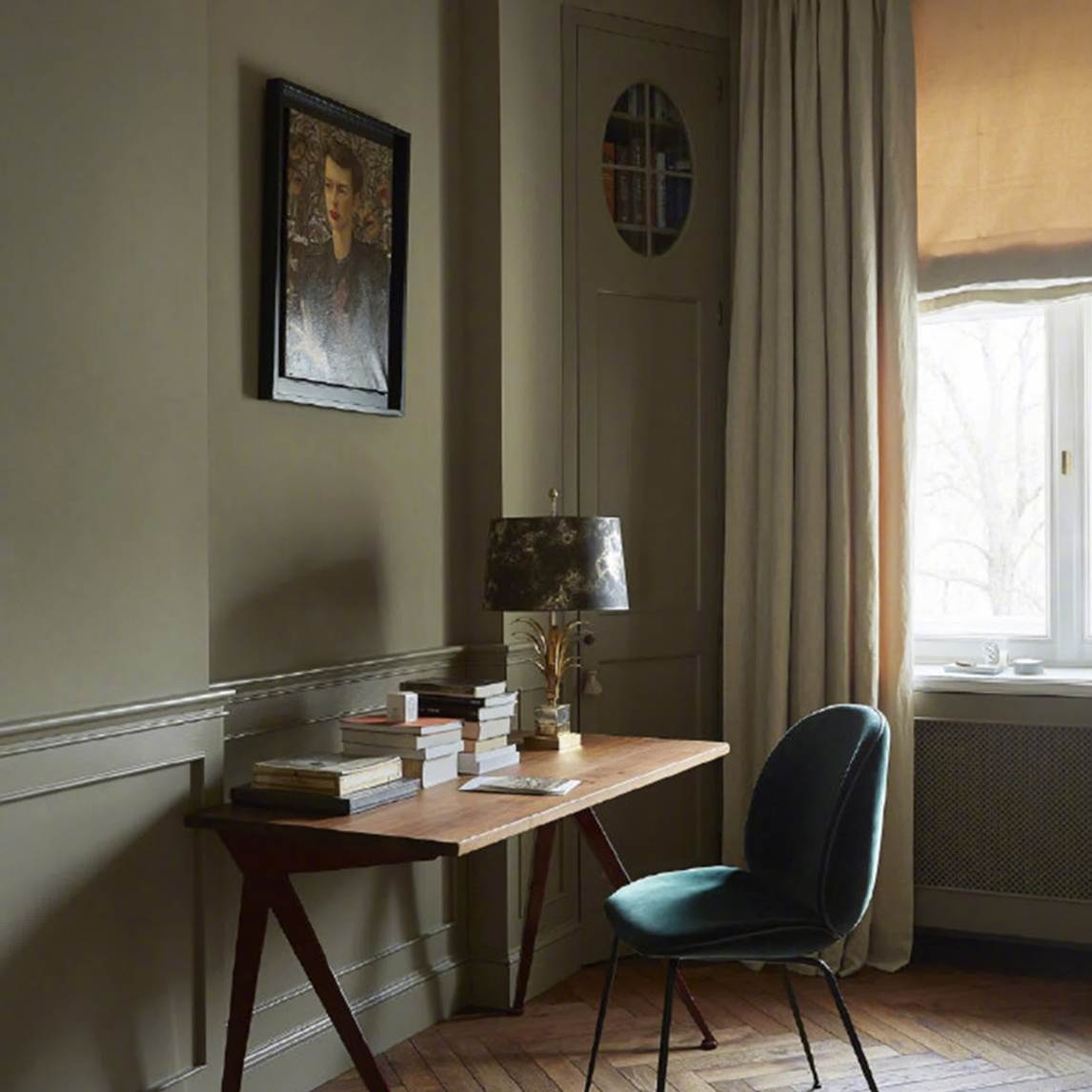 整体颜色色调以冷色系为主,桌上复古式的台灯,实木制作而成的书桌,但铁艺式的椅子却体现了整个书房的时尚古朴之感,满满的复古文艺气息。