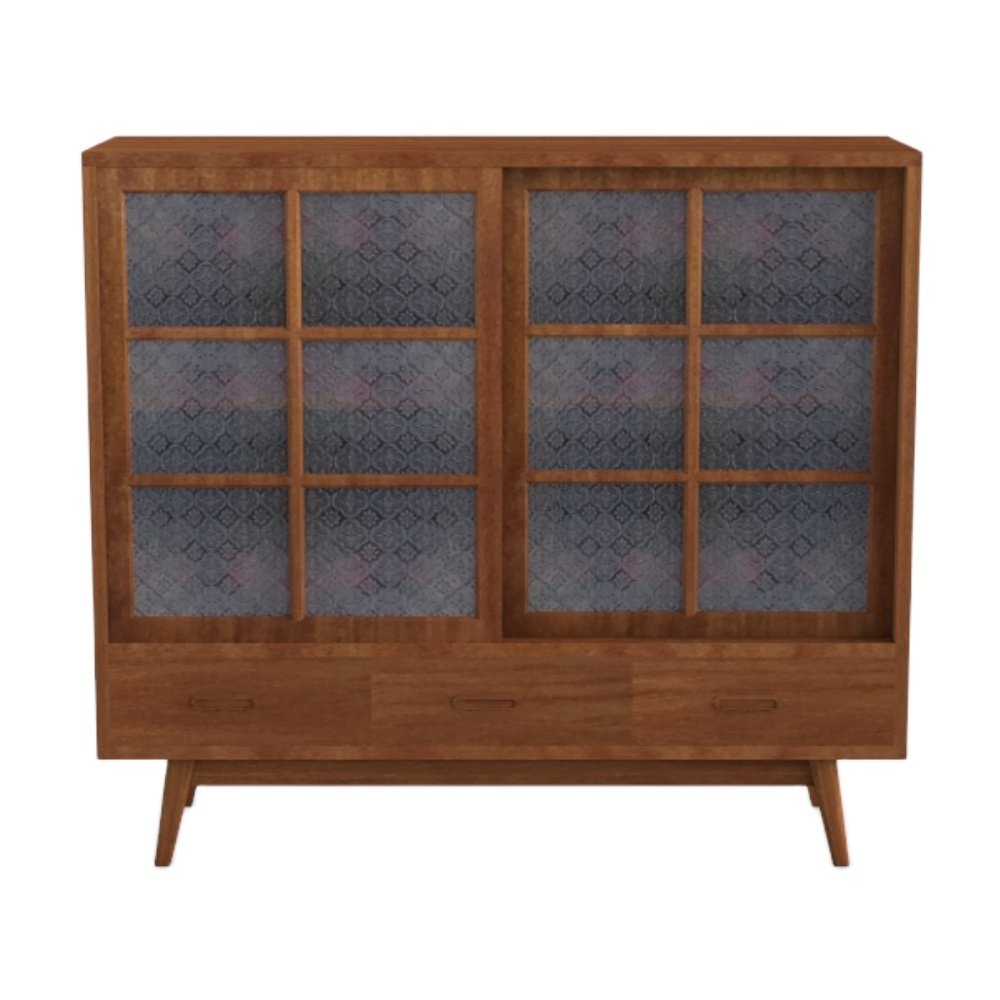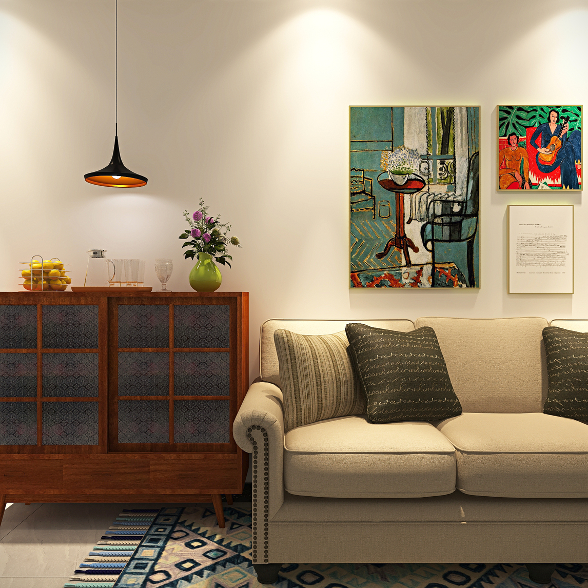 客厅空间地面是鱼骨铺地板让空间有了纵深感,色调以米色为主色调加入了浓郁的复古色,加上很有层次做旧的木质家具,增添了不少复古感。