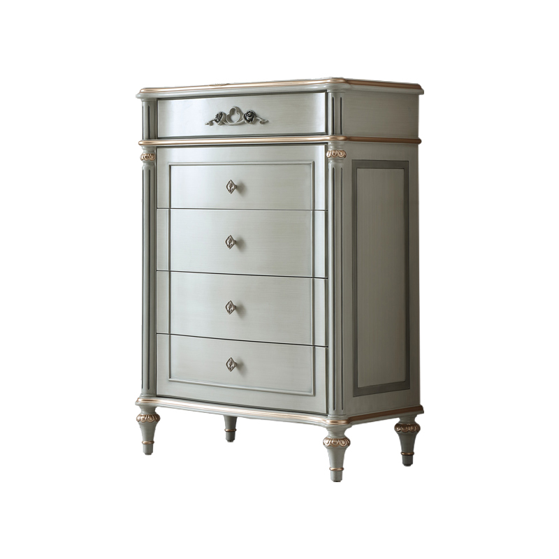 大气直板床头轮廓,线条起伏唯美灵巧,向内合拢的弧度,恰似一个适意牢靠的怀抱,予你睡前温暖的倚靠。为凸显法式风情,床屏及床尾做浮雕工艺,加以描金铺饰,让整体更优雅浪漫。