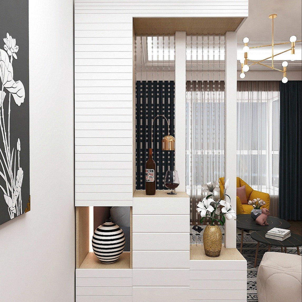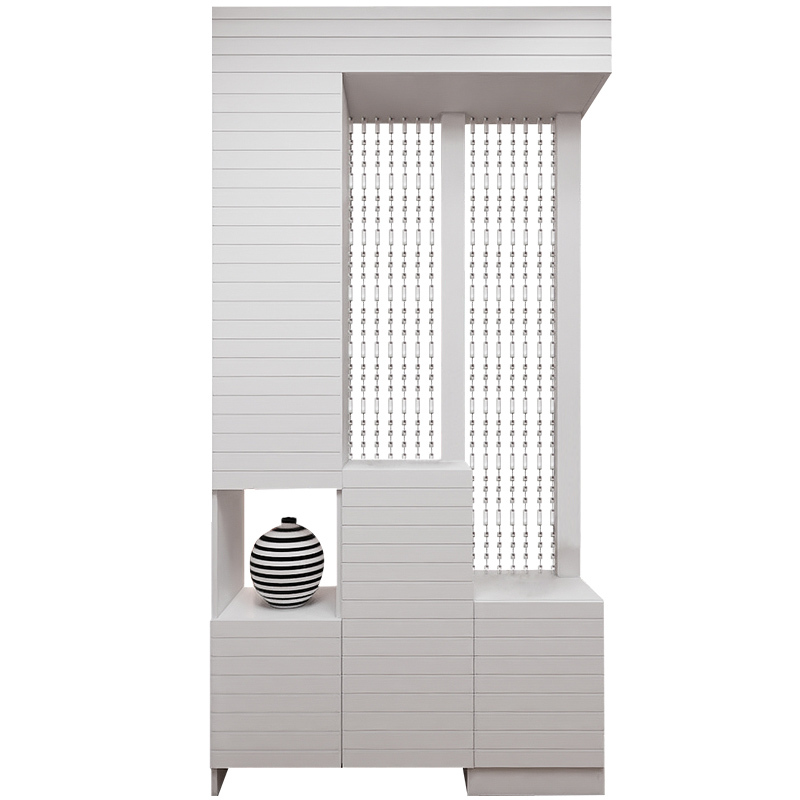现代简约玄关角落屏风隔断柜充分隔开了玄关与客厅的界限,不但能收纳,同时避免公共区域处一览无遗的状态,无形中增加空间趣味性,且保护主人隐私。
