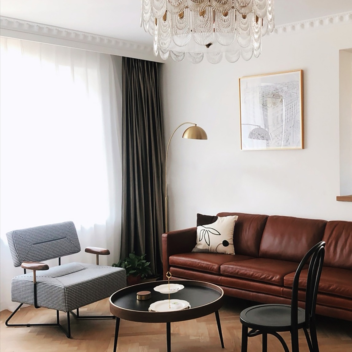 客厅大面积的白色,需要一些跳跃的元素去打破单调,所以客厅有了这盏非常宫廷风的吊灯,让整个客厅一下高端大气起来,千鸟格沙发则打破了土灰大沙发的沉闷,一个简单的小圆桌,放置茶盘,起到一点点缀作用就好!