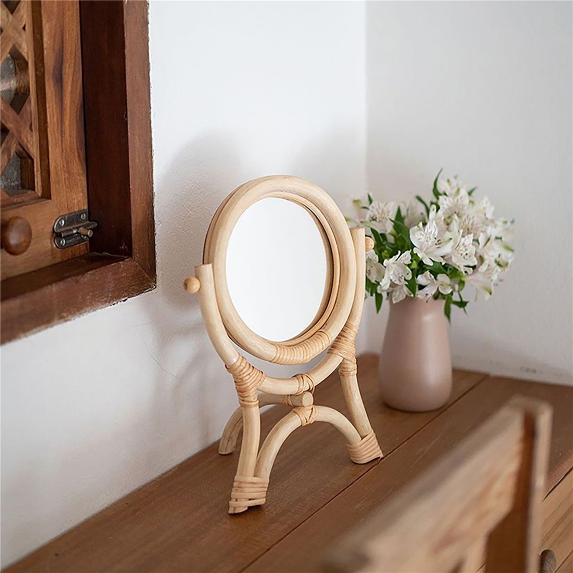 是一种民宿风的感觉,手工编织的小镜子,头大身小的结构,给人一种呆萌乖巧的感觉,天生自带亲和力,作为化妆镜的同时,还是个可以玩耍的小摆件。