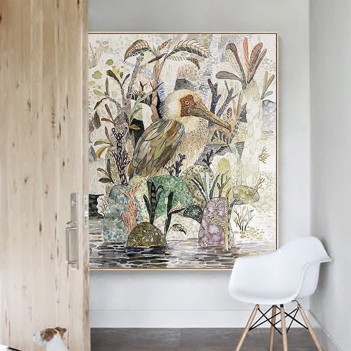 属于现代风的方形壁画,花鸟的图案设计也比较清新自然。色彩的搭配也比较独特,看着舒适温和。偏写意的风格,能打造独特的艺术气息。方形的木质画框,也是很精美的做工,圆滑美观,油画布材质更加耐用。