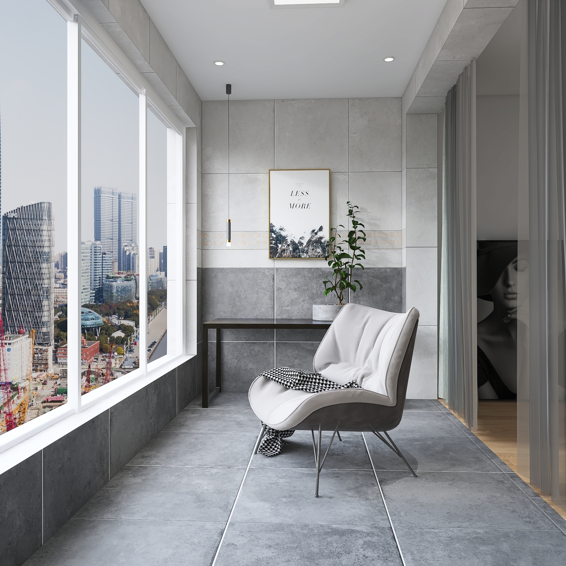 深色水泥砖半墙搭配浅色。有着硬朗的气质,粗粝质感的墙面,深色地面,酷感十足。为了平衡冰冷的室内环境工业风的阳台,用最少的装饰营造干净的视觉效果
