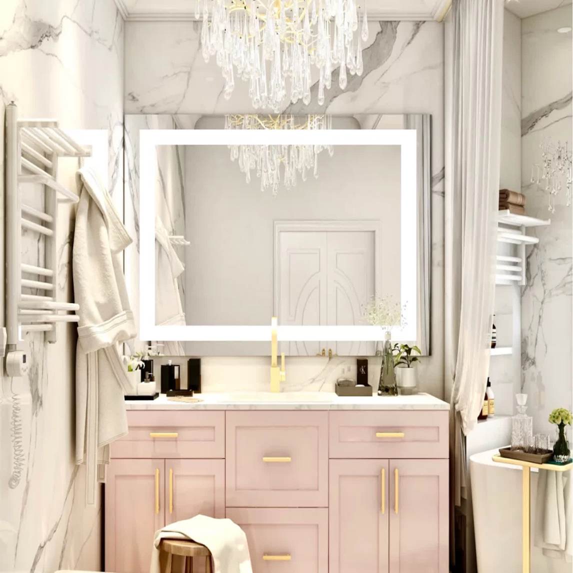 轻奢风浴室,少女心浪漫法式风情!整体色调以粉白为主,简直让女生的少女心爆棚~墙面与地面用大理石瓷砖铺满,显得高级有内涵!配上会发光的化妆镜,待上一天也不腻!