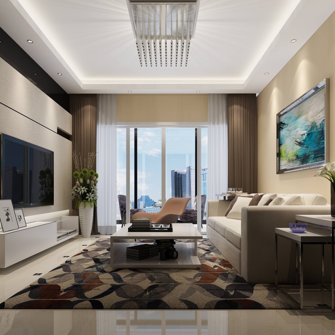 整个客厅采光极好,空间也很宽松,超薄智能声控4k电视,极简茶几,舒适的沙发搭配美式花瓶,说不出的美感,让人赏心悦目