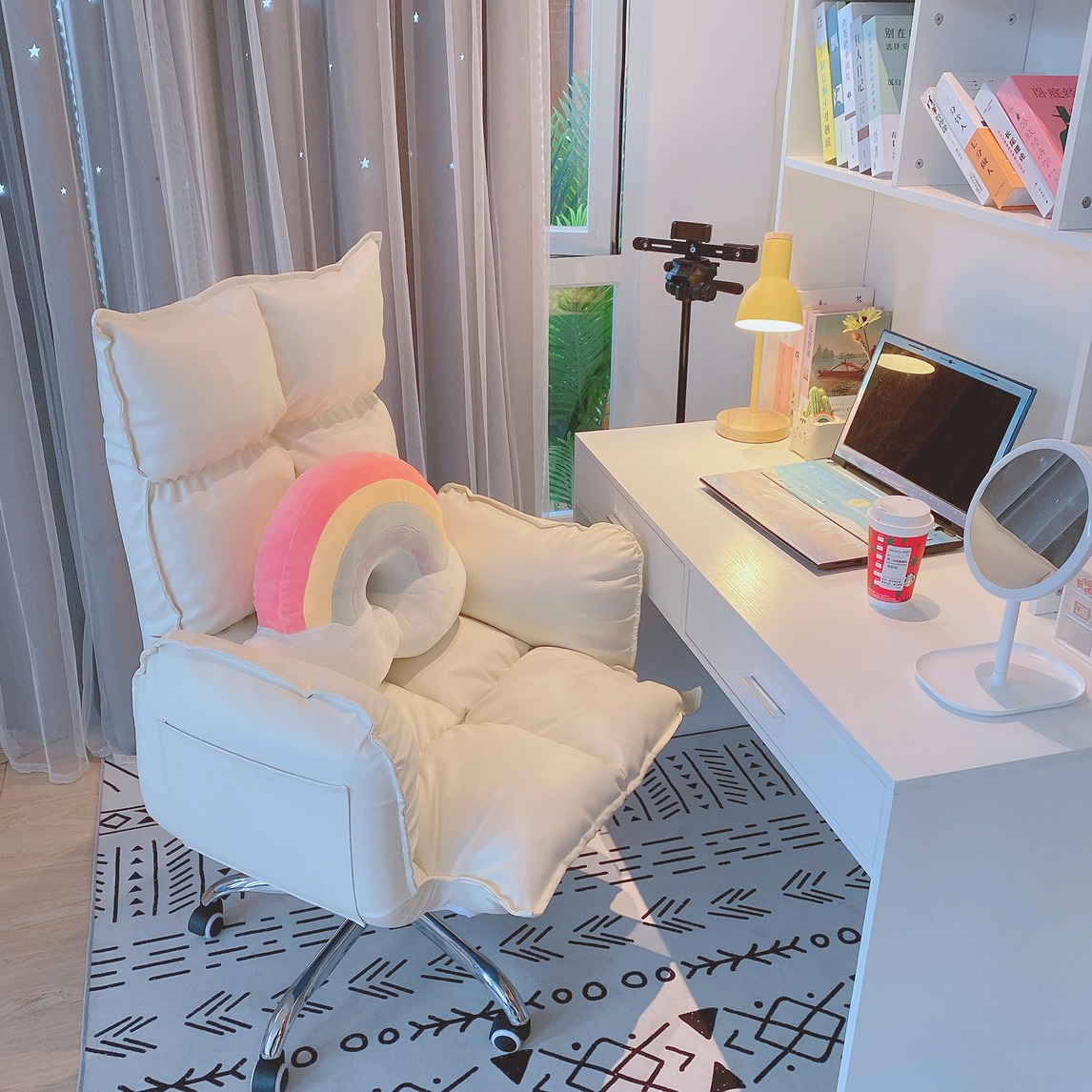 家里书房跟办公室不同,可以适当加入自己喜欢的风格元素,打造出温馨的感觉,学习和工作可以事半功倍哦~舒适的沙发电脑椅,阅读之余靠着刷刷剧,轻松度过美好休闲时刻,ins风的彩虹造型抱枕,使得整个书房都变得...展开