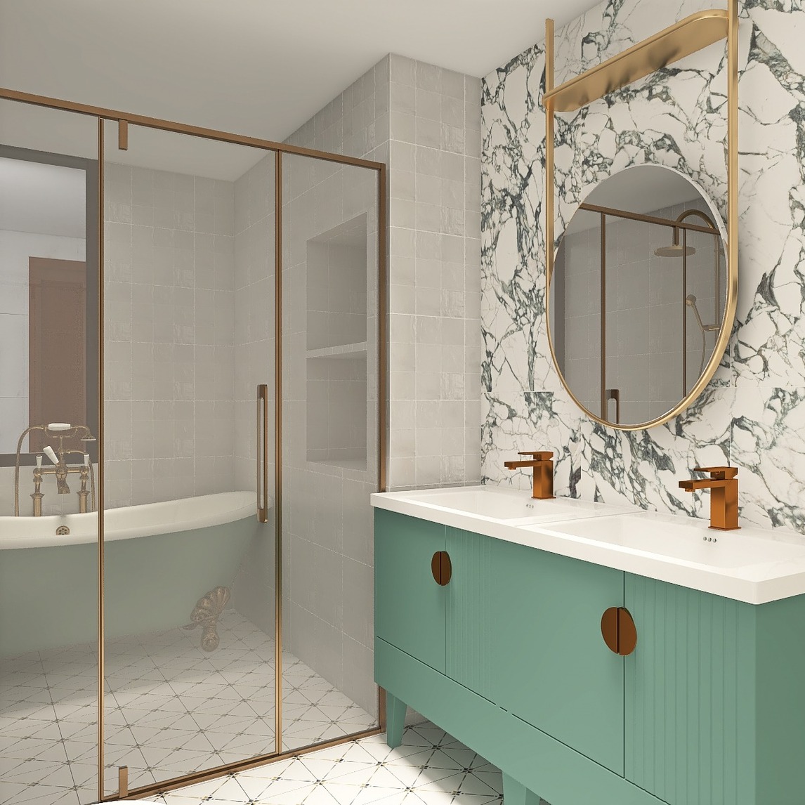 洗漱台的大理石背景墙的的纹理营造出一种奢华的感觉,与地面上的古典风格花砖搭配,再佐以黄铜元素的镜子,打造美好轻奢风。