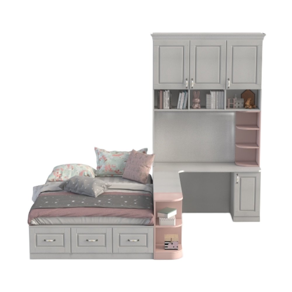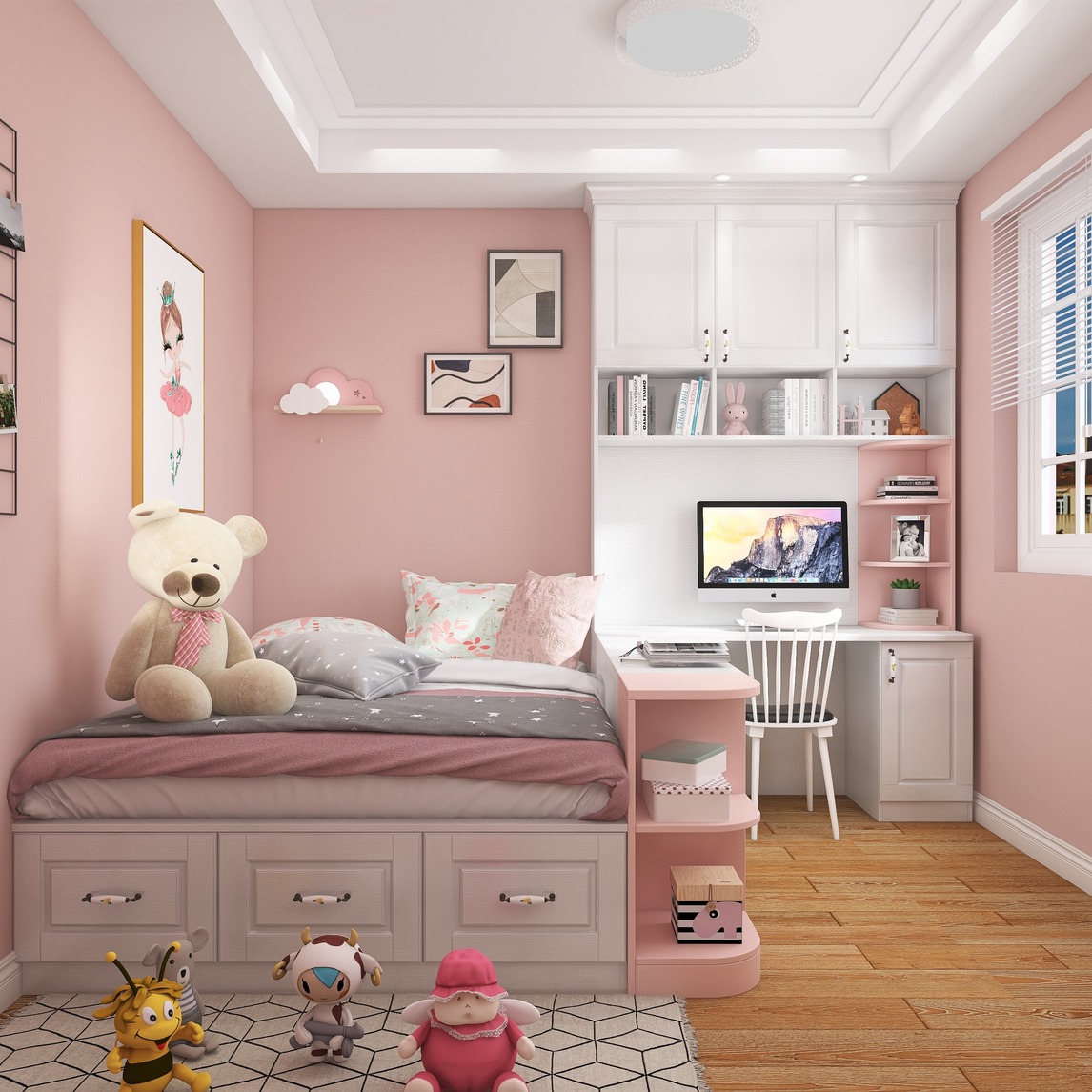 这款欧式女孩子儿童房,转角书桌柜增加空间功能性,阅读画画都能行;而转角圆弧处理,防止磕碰受伤,给宝贝细心周全的呵护