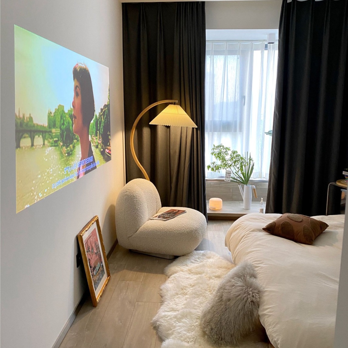 卧室墙上没有装电视和储物,改用投影,扩大了空间,又增加了观影体验。在床上就能体验到电影院般的4k高清电影,除此之外,羊毛地毯也是一个很好的观影区。