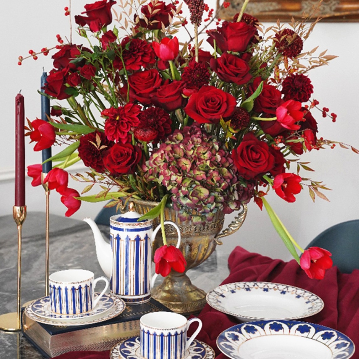 圣母院系列餐盘和杯子茶壶一套在桌面,太美美美,显得美轮美奂。在精美的花朵上衬托出空间优雅奢贵的气质!