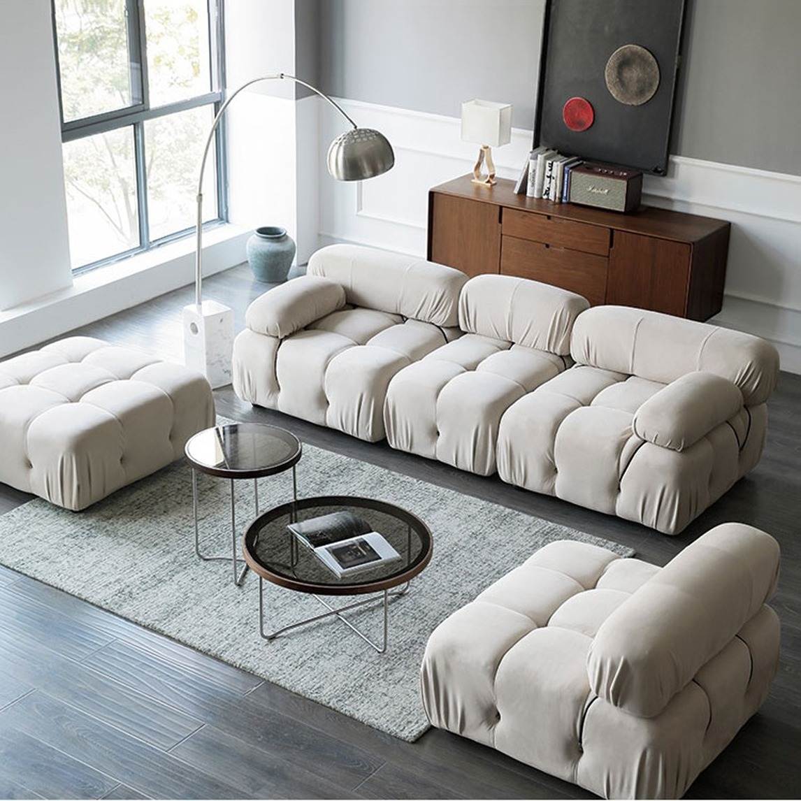 创意面包造型的沙发集颜值与实用于一体,简约的造型勾勒出时尚品味~搭配意大利flos钓鱼落地灯,为空间增添一份艺术气质。