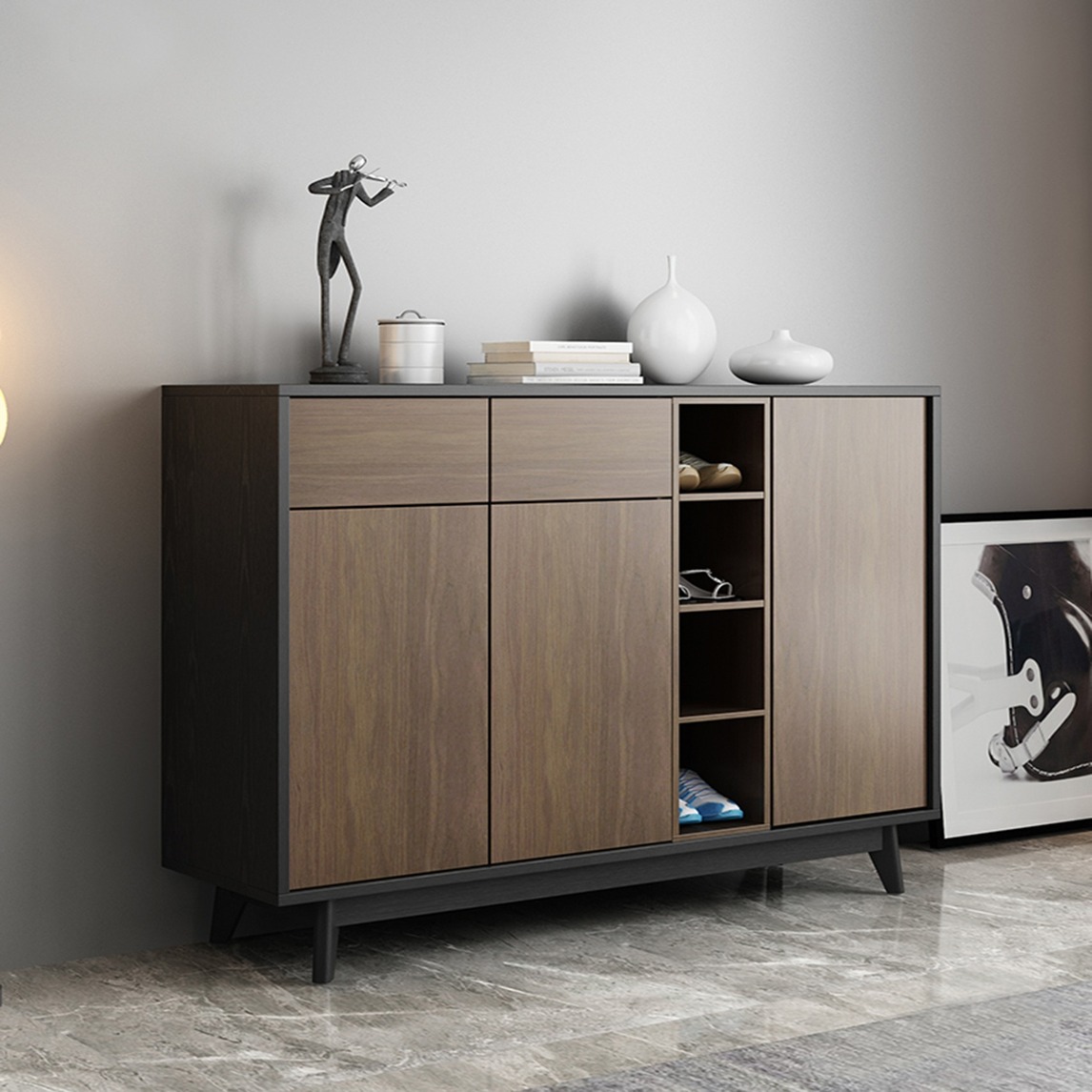 一款北欧风格玄关柜,优质实木为材质打造其整体框架结构,耐用经久承重力强。内部合理储物空间设计,轻松助力居室主人收纳整洁进门空间!