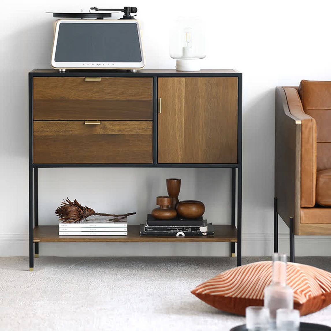 黑色铁艺框架,深沉且牢固~高脚架的设计,方便底部的清理,脚部配有地板保护垫,也可调节高度~柜内皆能放下大寸书籍~