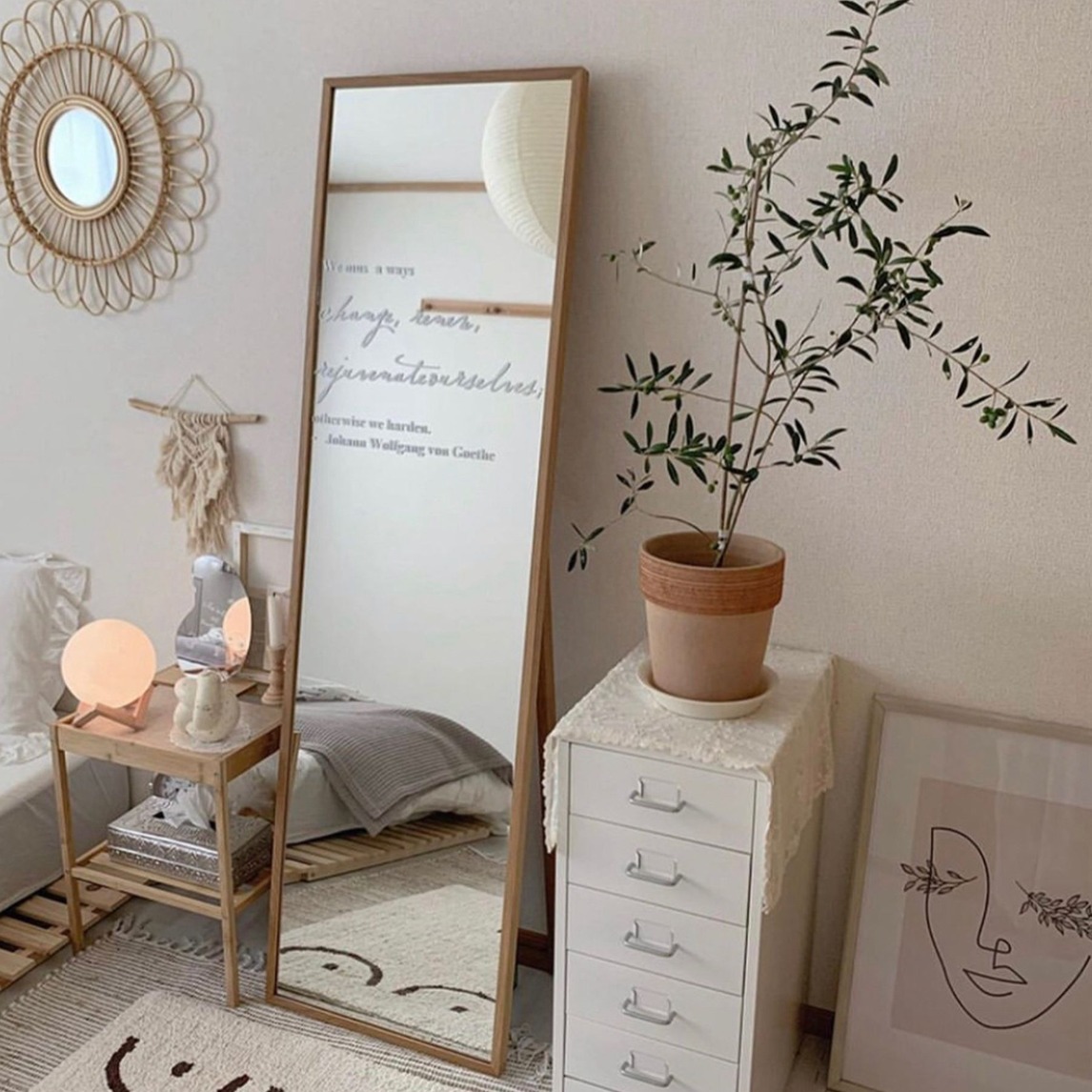 卧室以原木色和白色等色调为主,既温馨又显得空间大。藤编挂镜有一种自然地气息,挂在墙上即可当镜子又可当装饰。创意地毯ins风满满,踩上去脚感太爽了