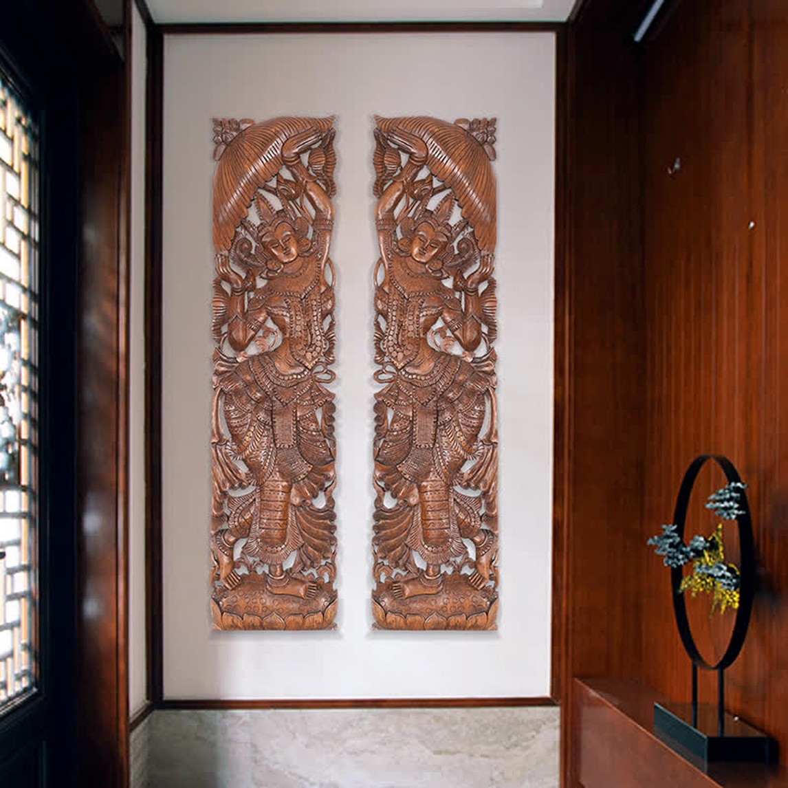 整块柚木精心雕刻而成的一款墙饰,运用精湛的雕刻工艺,将泰佛形象完美呈现了出来,并且表面经过做旧处理,更显工艺品的神韵,也散发出了时间的气息,从而可以提升居室的格调。