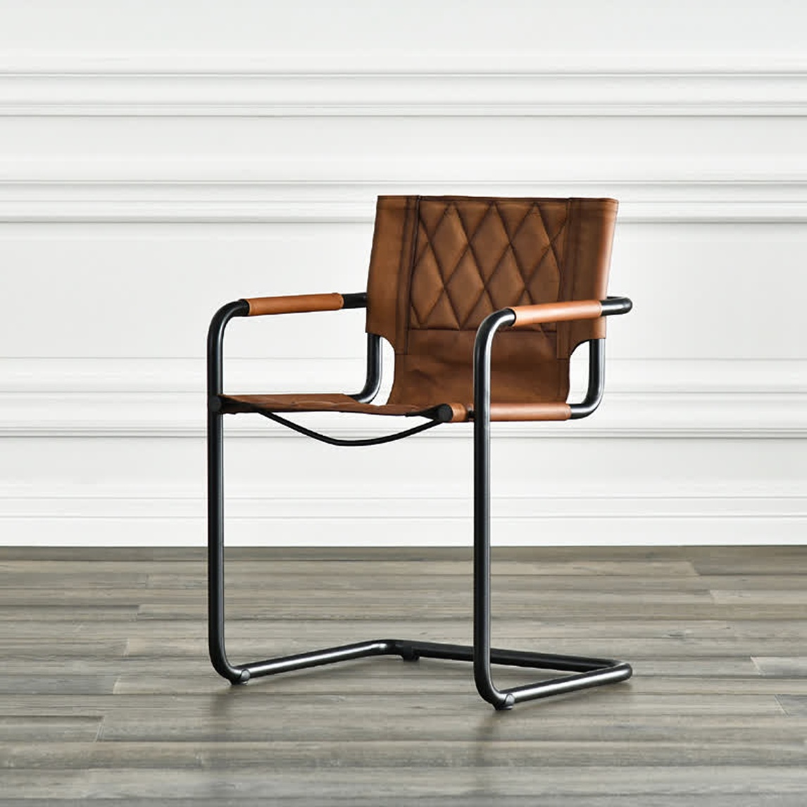 撇去了传统的笔直四腿,转而采用简单的C字型结构,大气干练承重力强。扶手处包裹的牛皮与整块的真皮坐垫相呼应,质感十足。椅垫与椅背处的皮垫采用了精细的菱形工艺,打破寡淡的同时缔造绝佳的坐感。