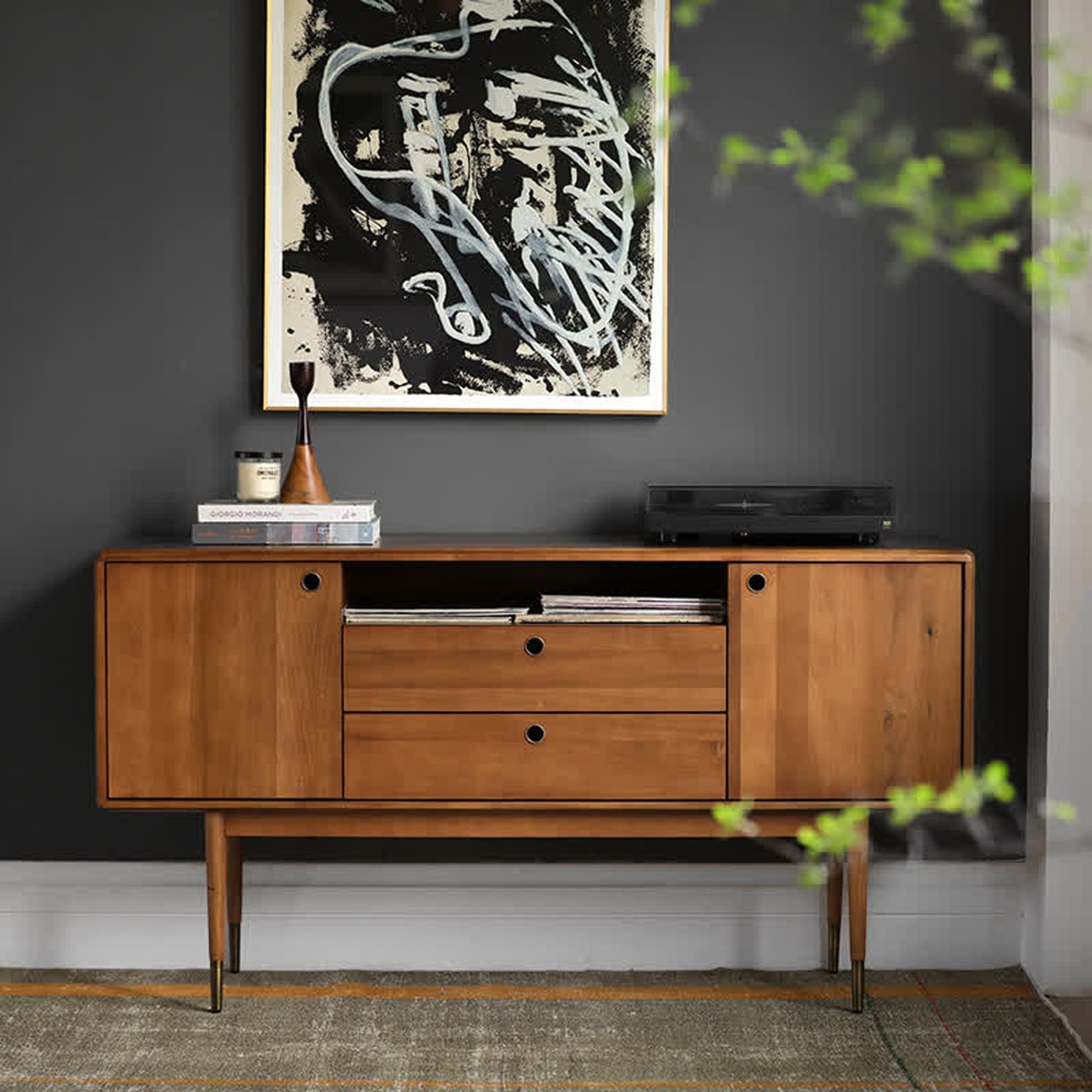 餐边柜以胡桃木色漆面呈现,为美国杨木带来了全新的诠释,且整体设计将自然、简约、怀旧等风格融合在一起,充满了现代的都市气息;而柜腿配合铜包脚设计,彰显了设计师对于作品细表达的苛刻要求,无论从哪个角度去欣...展开
