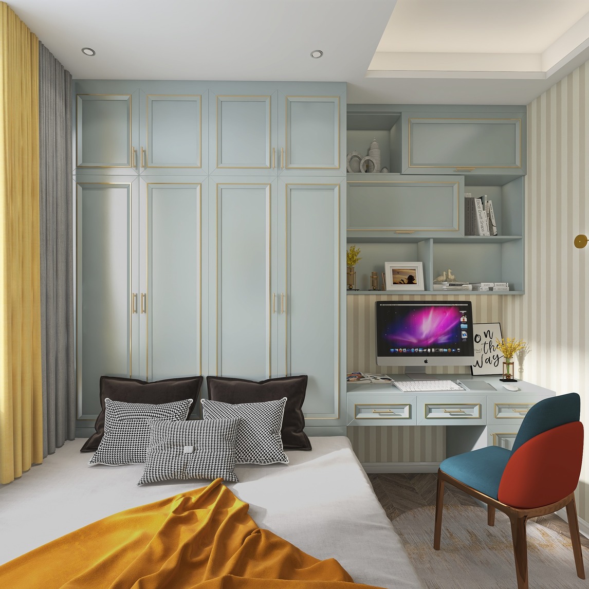 年轻人张扬个性,热爱时尚色彩,挪威蓝色的卧室深受他们喜爱。金边细线勾勒,简约中透露精致,榻榻米、衣柜、书柜、书桌一体化设计将空间利用得淋漓尽致,是小户型的不二之选。搭配黄色系窗帘相得益彰,在筒灯的照射...展开