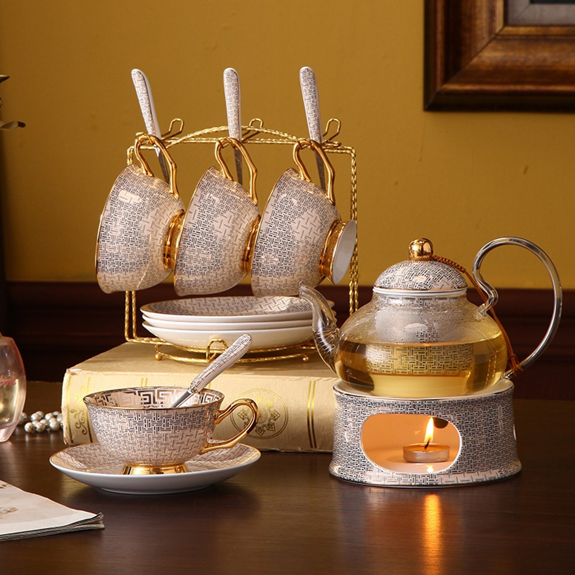 英式风格的茶具,要么是白色加香槟金,要么就是带有花纹的,凸显浪漫情调。三明治、司康饼、蛋糕和甜点自下而上摆放,有端庄优雅的英式感。