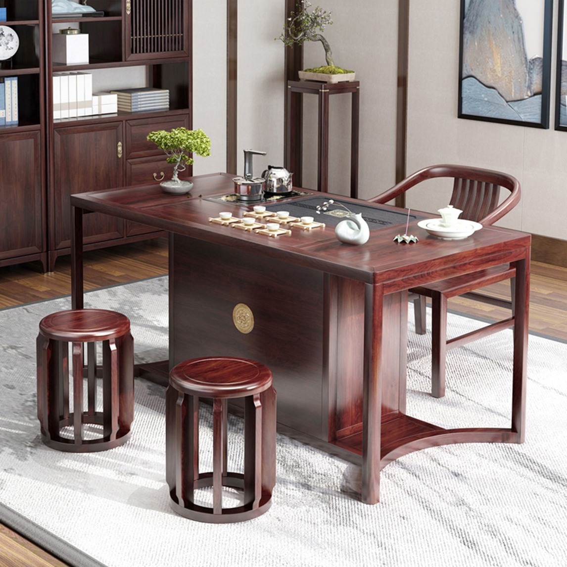 餐厅选用十分典型的新中式风格打造,实木材质的圆形餐桌,搭配仿古餐椅,然后用灰色泼墨地毯烘托出古色古香的氛围;同时还加入优雅国风山水画屏风作为背景装饰,打造出充满江南温婉格调的中式韵味,让吃饭这件日常小...展开