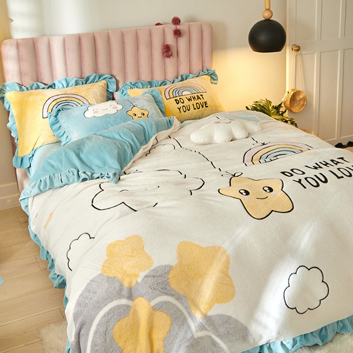 大版雪花绒牛奶绒工艺款系列套件,枕套花边与牛奶绒的巧妙碰撞。 雪花绒绒毛细腻,触感柔软,亲肤舒适,保暖性强,是一款享受温暖不将就的生活床品。
