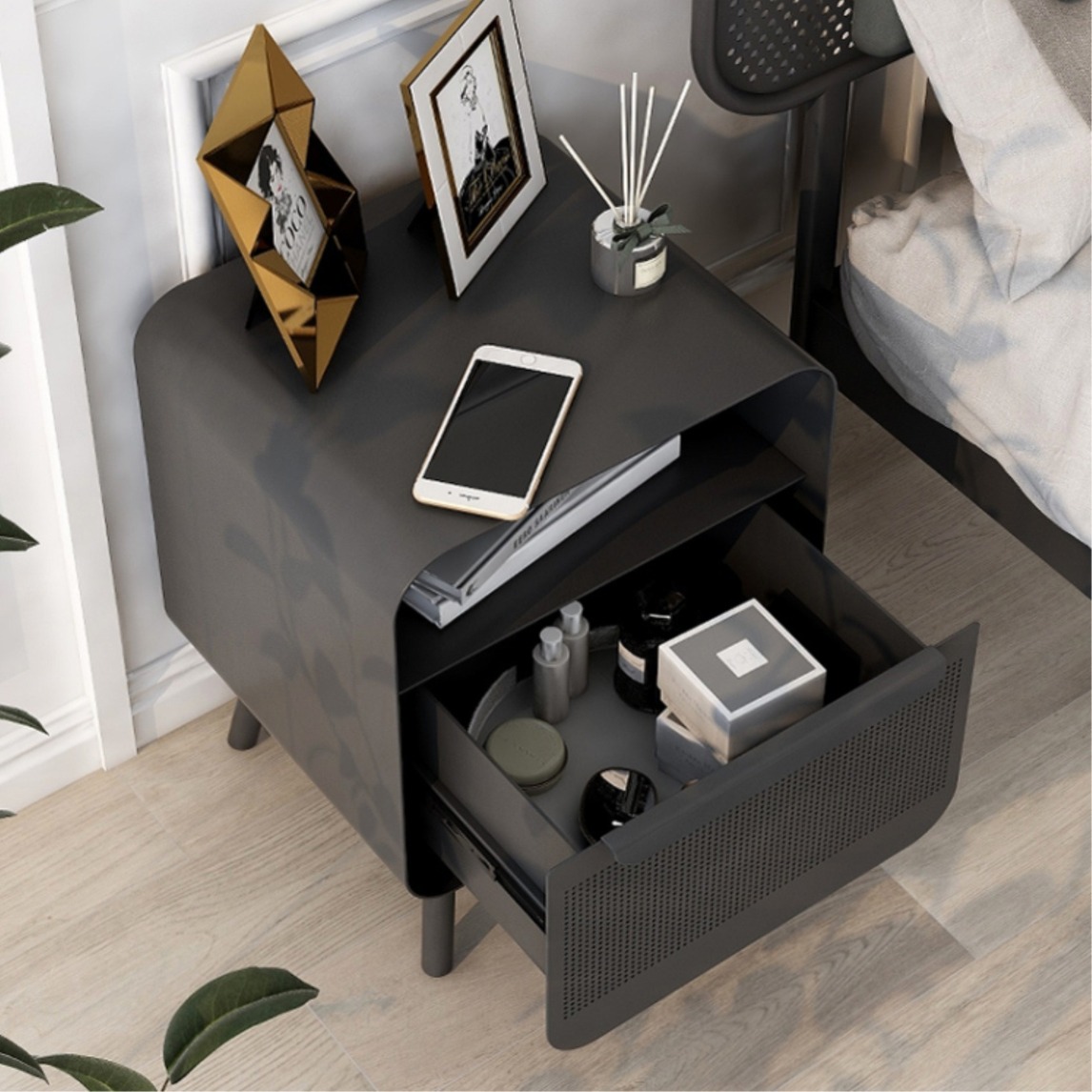 酷似老式收音机的呆萌床头柜,它方头方脑,有着工业时代独有的敦实外表。用洞洞板模拟音箱网罩,更是身形兼备,惟妙惟肖。