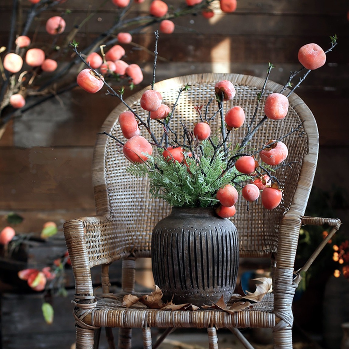 一颗颗饱满的柿子,还带着白色的秋霜和肌理,与真柿子无异,可以是一串串,也可以是一枝枝,插着很有复古感和艺术感。