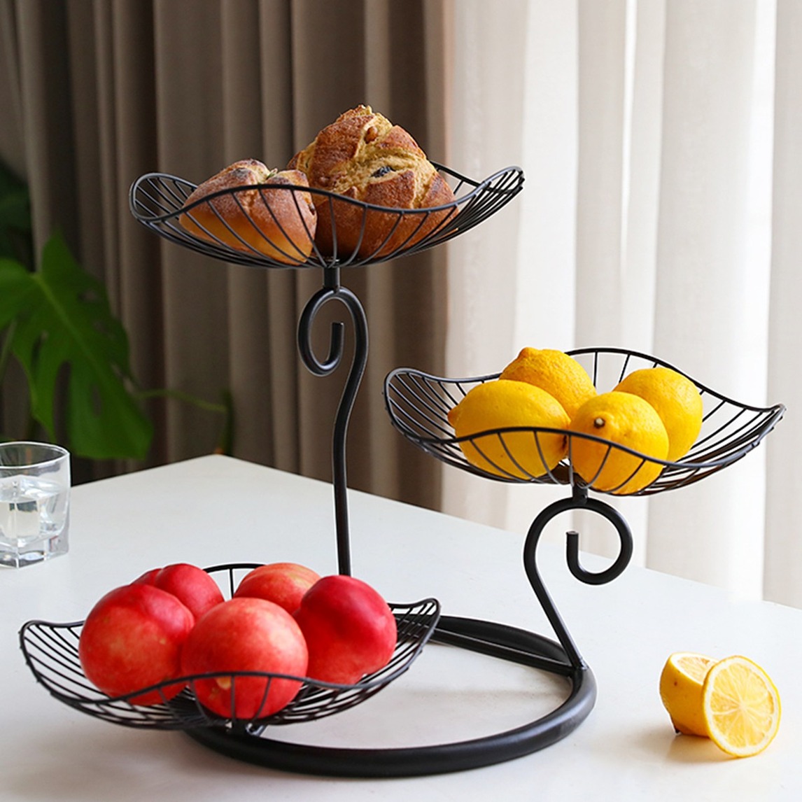 轻奢质感的铁艺果篮,占地小容量大,多层的设计比传统果篮节省空间,可以放多种水果,放在桌面上稳稳的,也好看。