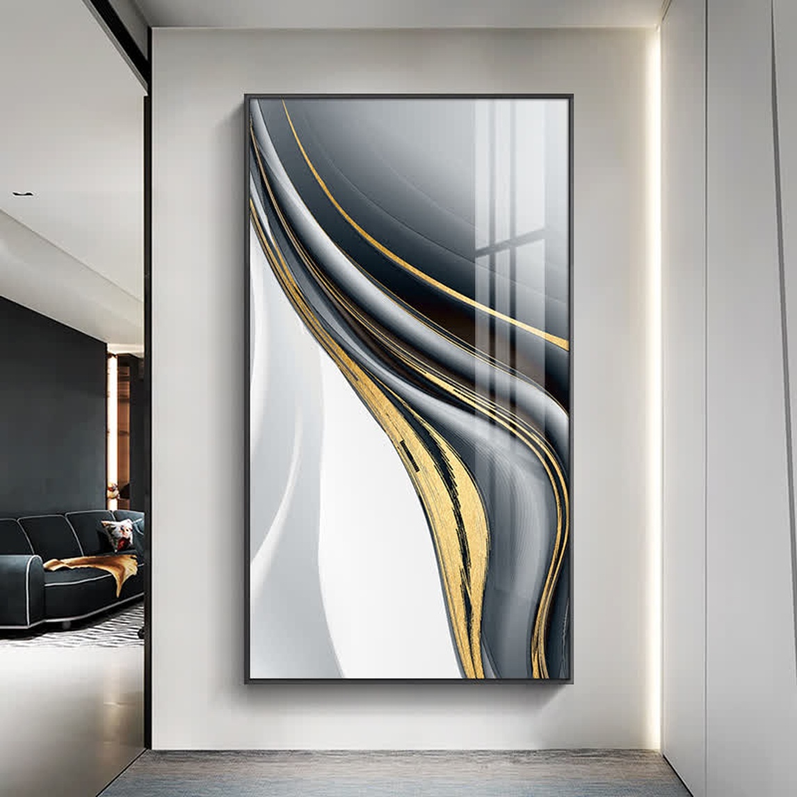 以雅黑相接紫金,以紫金包容雅黑,表达了作者聚也圆满散也圆满的意境,或充实或骨感,一切皆有你体会,闪亮的紫金让家居蓬荜生辉,耀眼夺目,纯银或银黑的外框,整体彰显出作品的高端质感。