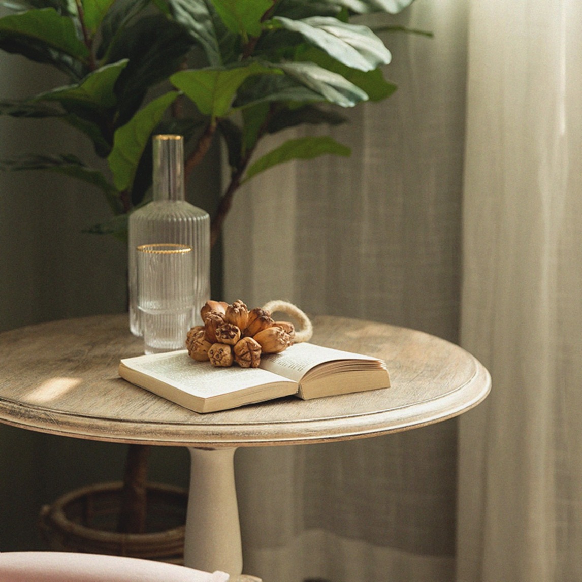 如果你想要打造一个精致的客厅一角,选择用一个圆桌做茶几,这样的设计能使客厅看起来很有创意和宽敞。摆放精致的茶具,显得宁静又清新。