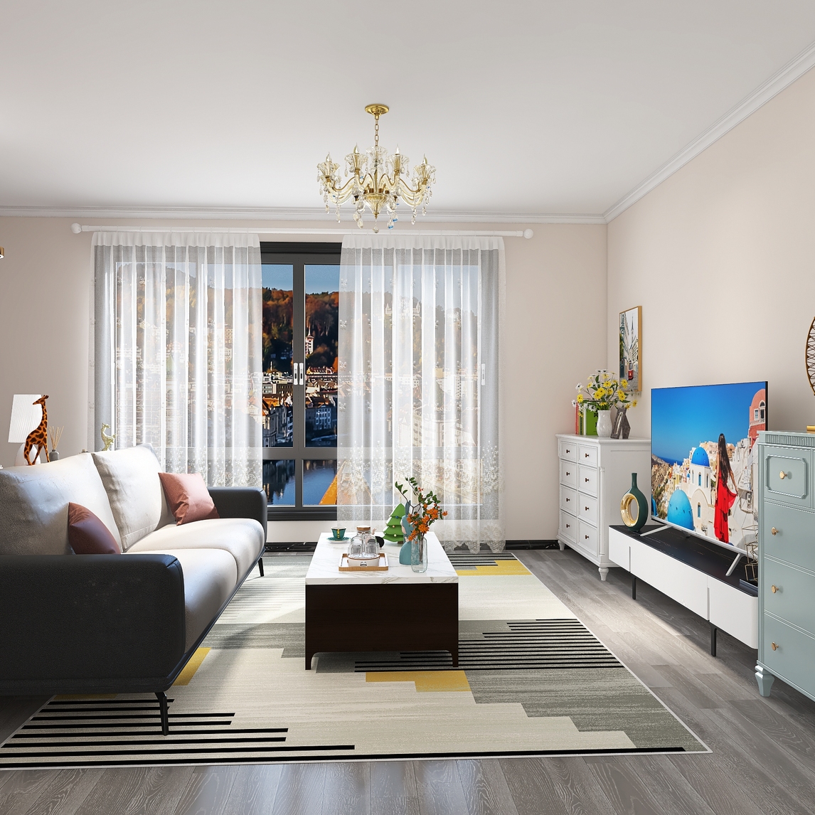 沙发茶几电视柜,是客厅的三要素,统一的风格会让家具这款看起来更加和谐,水晶灯饰则为空间点缀出大气精致的格调,边柜色彩相对丰富,简单却不失格调。