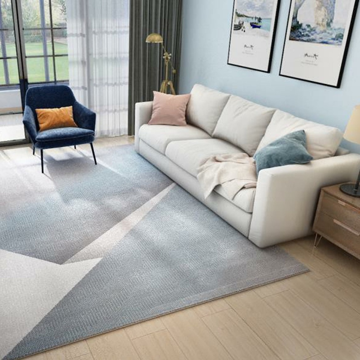 温馨舒适的客厅不需要太过于复杂,一张沙发一个单人沙发椅,铺上一张地毯就足够了,茶几都可以省去了,没事的时候坐在地毯上看书也很不错哦!