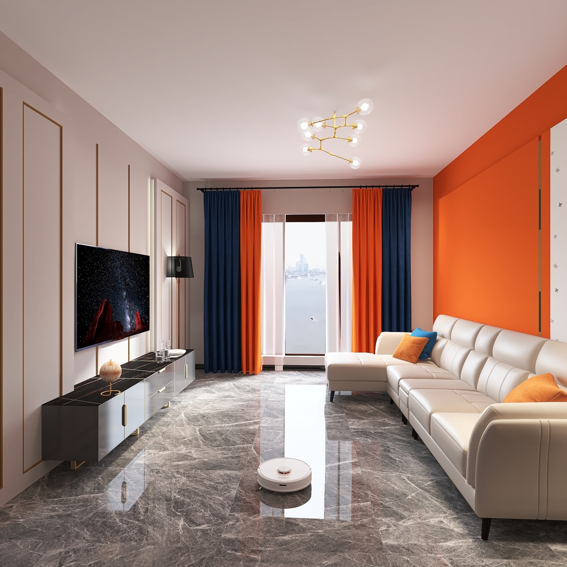 橘色的墙纸在色彩上让人感觉很温暖,大理石质感的地砖干净整洁。地面清洁的扫地机器人,给您温暖舒适干净的客厅。