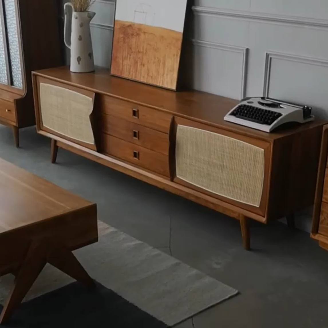 轻复古风电视柜是一种什么感觉 藤编+复古做旧工艺 北美顶级黄杨木 特殊手工的把手 在现当年实木的感觉 --------- 配套小雏菊边柜 昌迪加尔茶几 享受 轻复古的生活方式