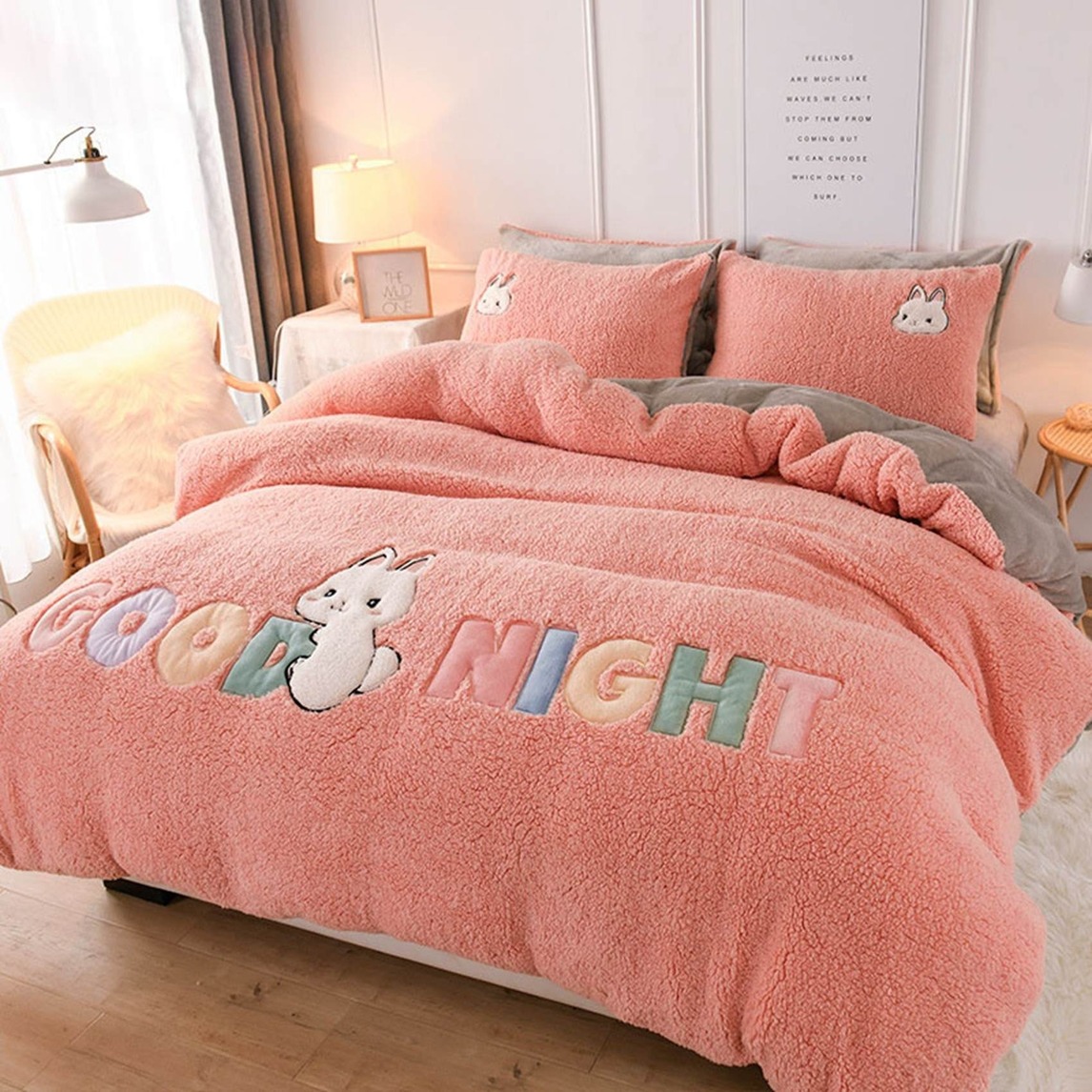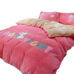 毛绒绒的四件套,看着就温暖,蓬松柔软的触感,具有很好的蓄热能力,很适合寒冷的冬天,可爱的卡通点缀,孩子能在温暖有趣的氛围下入睡。