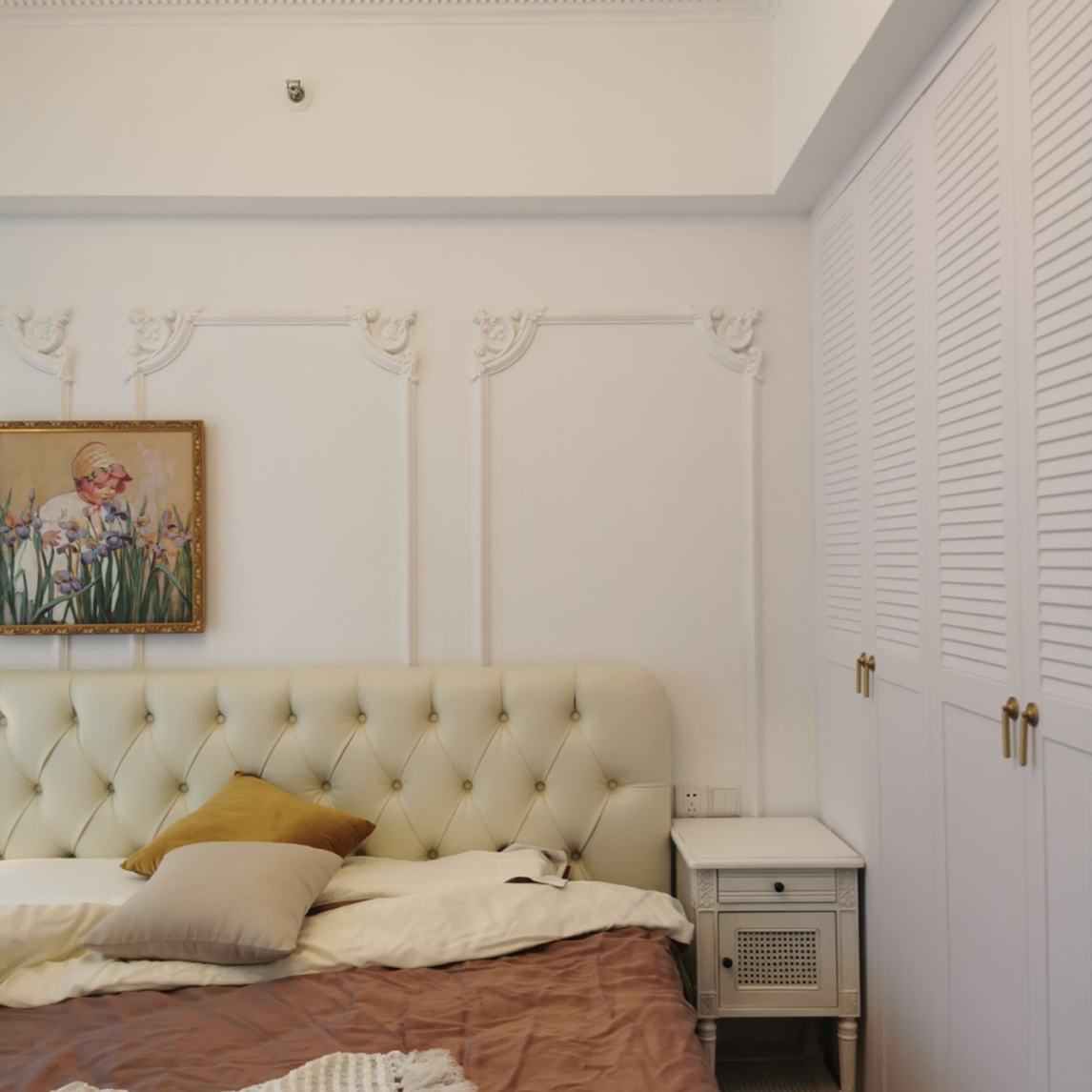 卧室做了个客厅同款的背景墙线条,然后只需要一副精致的画点缀即可 这里就可以体现为什么我第一篇说这个户型简直是为放钢琴量身定制的呢,因为餐厅真的很小啦,中间就很大一块空地 卧室的整个色调真的是超级温馨,...展开