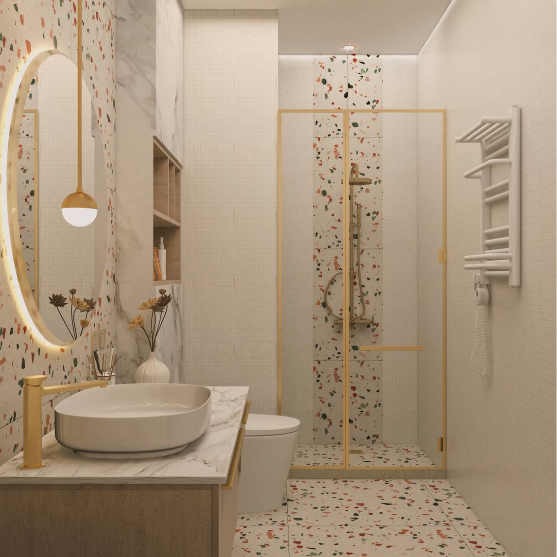 水磨石的卫生间真的太好看了!温暖治愈 水磨石瓷砖、大理石瓷砖以及小格纹白砖。大理石瓷砖只用在马桶区域,水磨石瓷砖铺设在地板以及洗漱区,并在淋浴区为花洒做背景,其他区域都大面积铺设格纹白砖。
