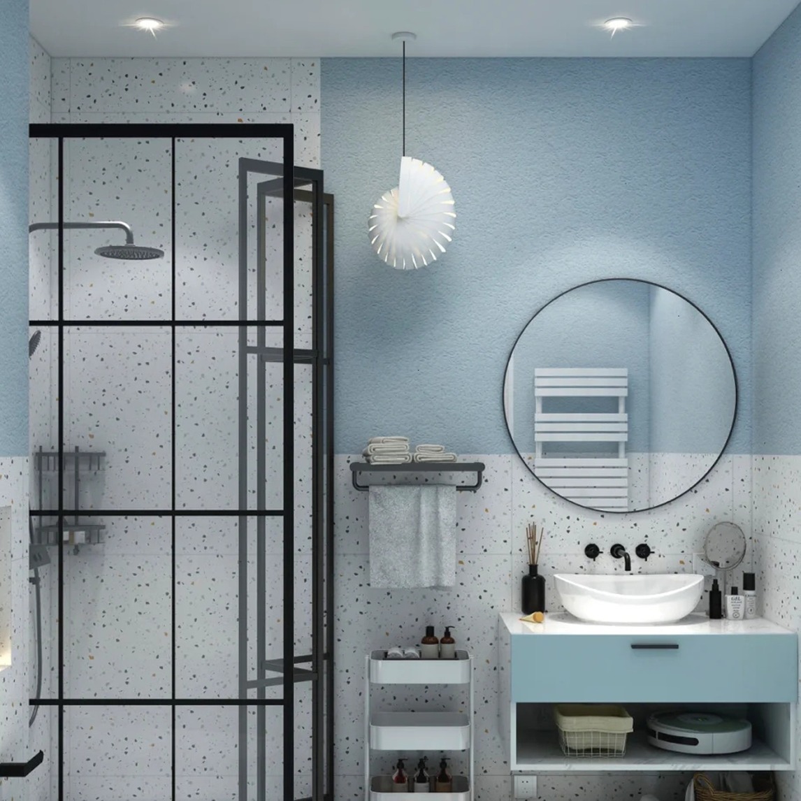 浴室淋浴区用可折叠的淋浴门,实现干湿分离。温柔的复古蓝拼花砖,再配一块简约条纹地毯,很搭呀。浴室柜旁边的小白推是装浴室各种用品的小宝贝,搭配蓝白色系的浴室柜真的也很美。