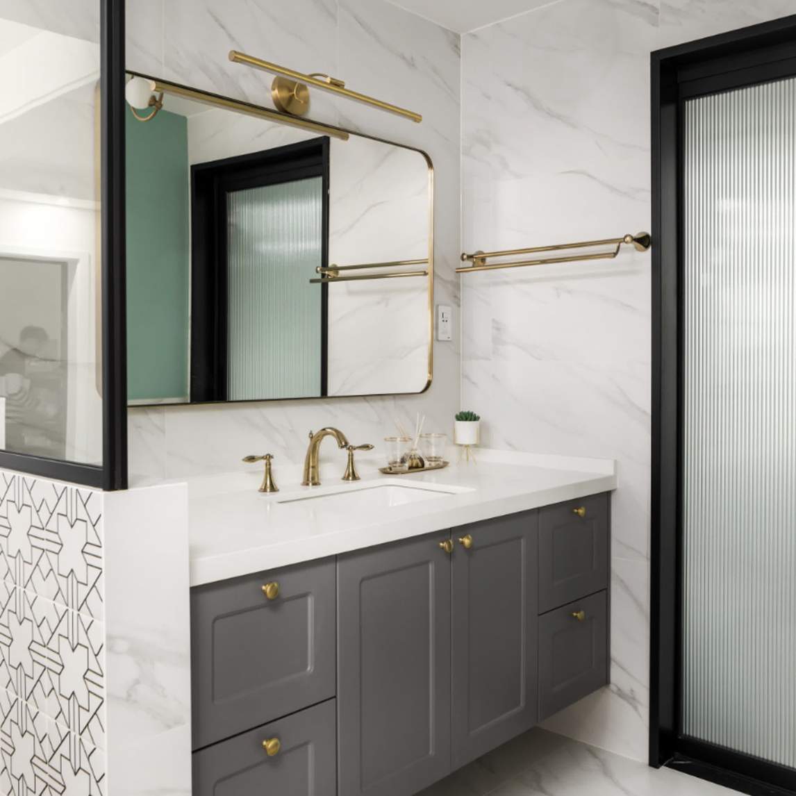 . 设计师采用了日本流行的“三分离”理念,将洗手台、淋浴房和马桶区域分开。整体金属件选用金色配色,独立的台盆区搭配了大块的长方型梳洗镜,宽敞明亮。 .
