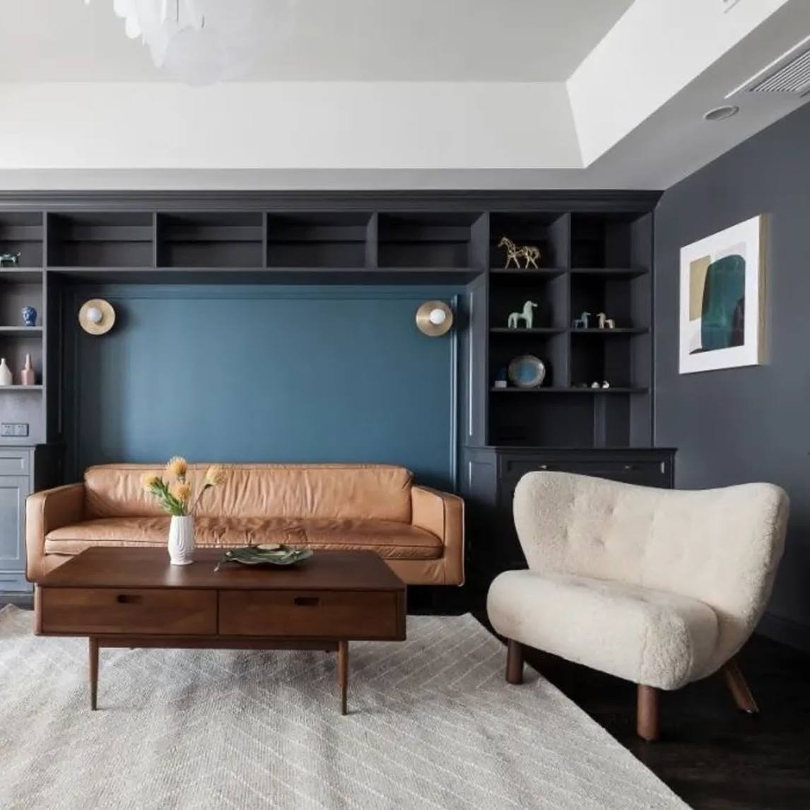 法式复古|超强色彩质感之家 客厅整体呈围合布局,动线流畅。嵌入深灰蓝色背景墙的皮质主沙发纹路自己触感柔和,纯黄铜底座放凳的面料分别选用了千鸟格和磨砂皮,地面是做旧的烟熏色木地板,每一寸空间都有着浓厚的...展开