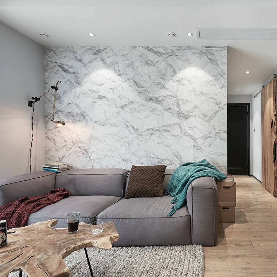 这间慵懒舒适的小客厅装修,选用了一些设计精巧的复古风家具。从充满野性的异形茶几到独特的手工编织地毯,再到墙上的工业风摇臂灯,它的风格透露出大胆的突破感,另外,让人不可忽略的褶皱背景墙也是它独具创新意识...展开