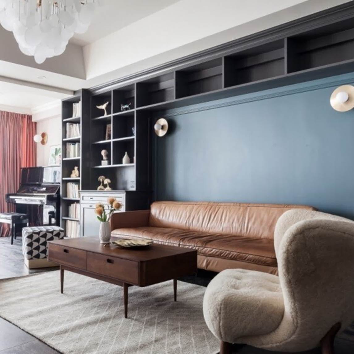 法式复古|超强色彩质感之家 1.客厅整体呈围合布局,动线流畅。嵌入深灰蓝色背景墙的皮质主沙发纹路自己触感柔和,纯黄铜底座放凳的面料分别选用了千鸟格和磨砂皮,地面是做旧的烟熏色木地板,每一寸空间都有着...展开