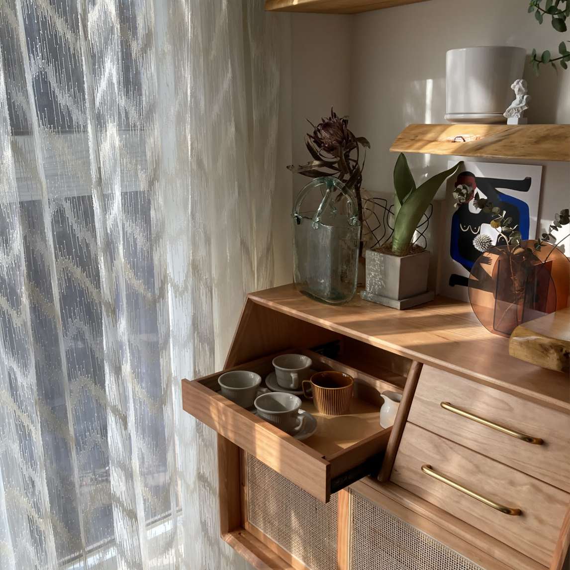 客厅采用了客餐厅一体式,拉长空间视觉效果,来弥补整体面积小的缺陷,让入户墙不单调,也增加了整体层次感,原木色木板,让整体空间颜色更温暖一些。