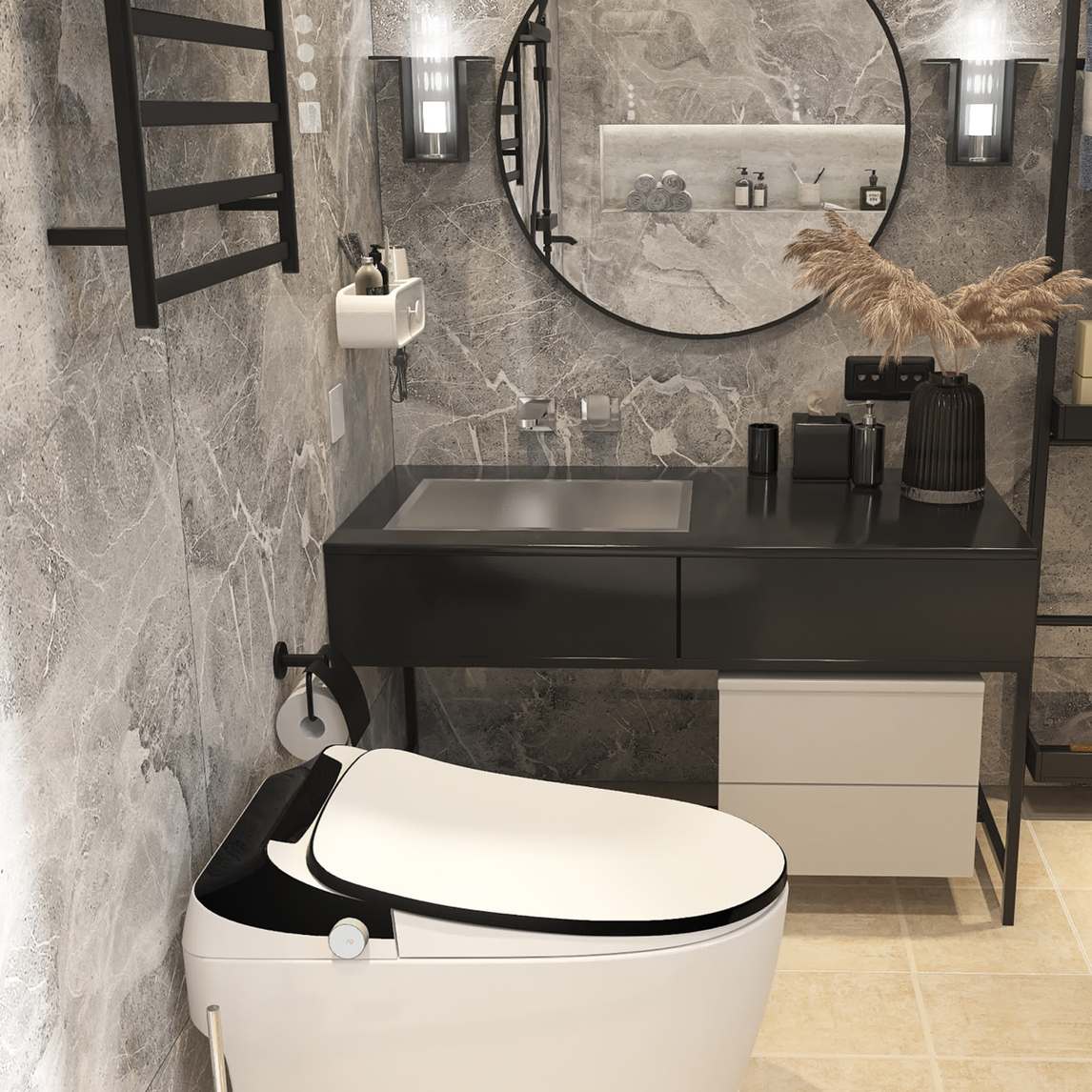 装修灵感|现代工业风中注入暖色系卫生间 工业风搭配水泥灰瓷砖,卫生间整体视觉冲击力十足 利用吊灯、筒灯来调节明暗度,吊灯还可以更好提高整个浴室的氛围 沐浴区用了一块玻璃挡板,可以很好的做了干湿分离。浴...展开