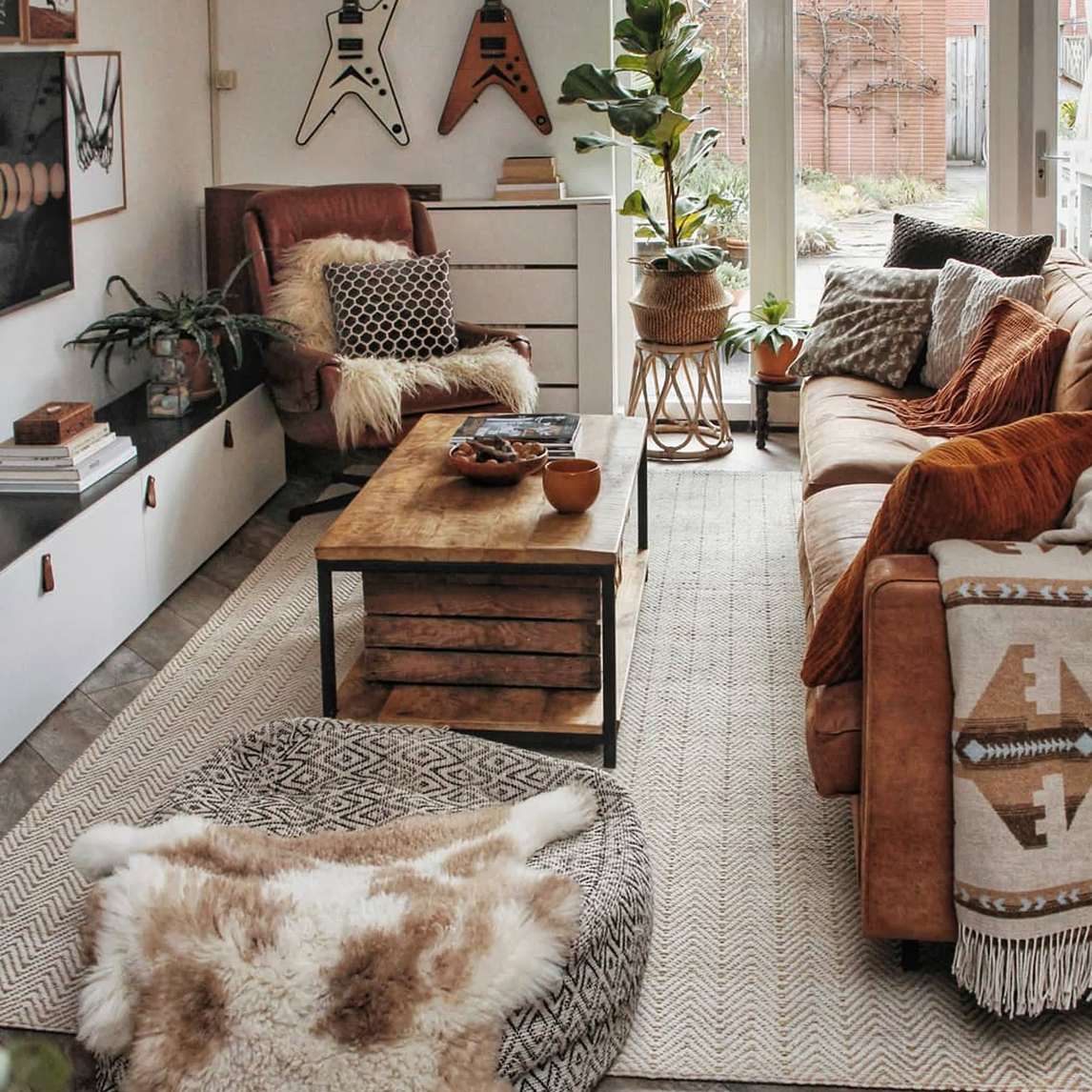 装修灵感|温馨耐看的复古小家 黄棕色的真皮沙发和做旧风格的原木茶几浓浓的复古气息,客厅摆满了舒适的抱枕和盖毯,配合温柔的暖光吊灯真的太温馨了