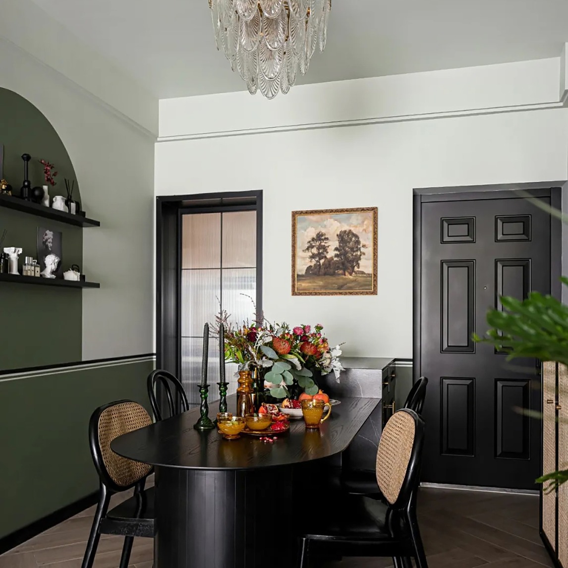 没有想到黑色和绿色的结合能够打造如此高级的空间,黑色的大餐桌造型简单却很有艺术感,配上藤编椅子,又显得不那么沉闷,顶上的水晶吊灯,复古挂画都是浓浓电影质感,这里用场感觉就像在高级法餐厅一样!