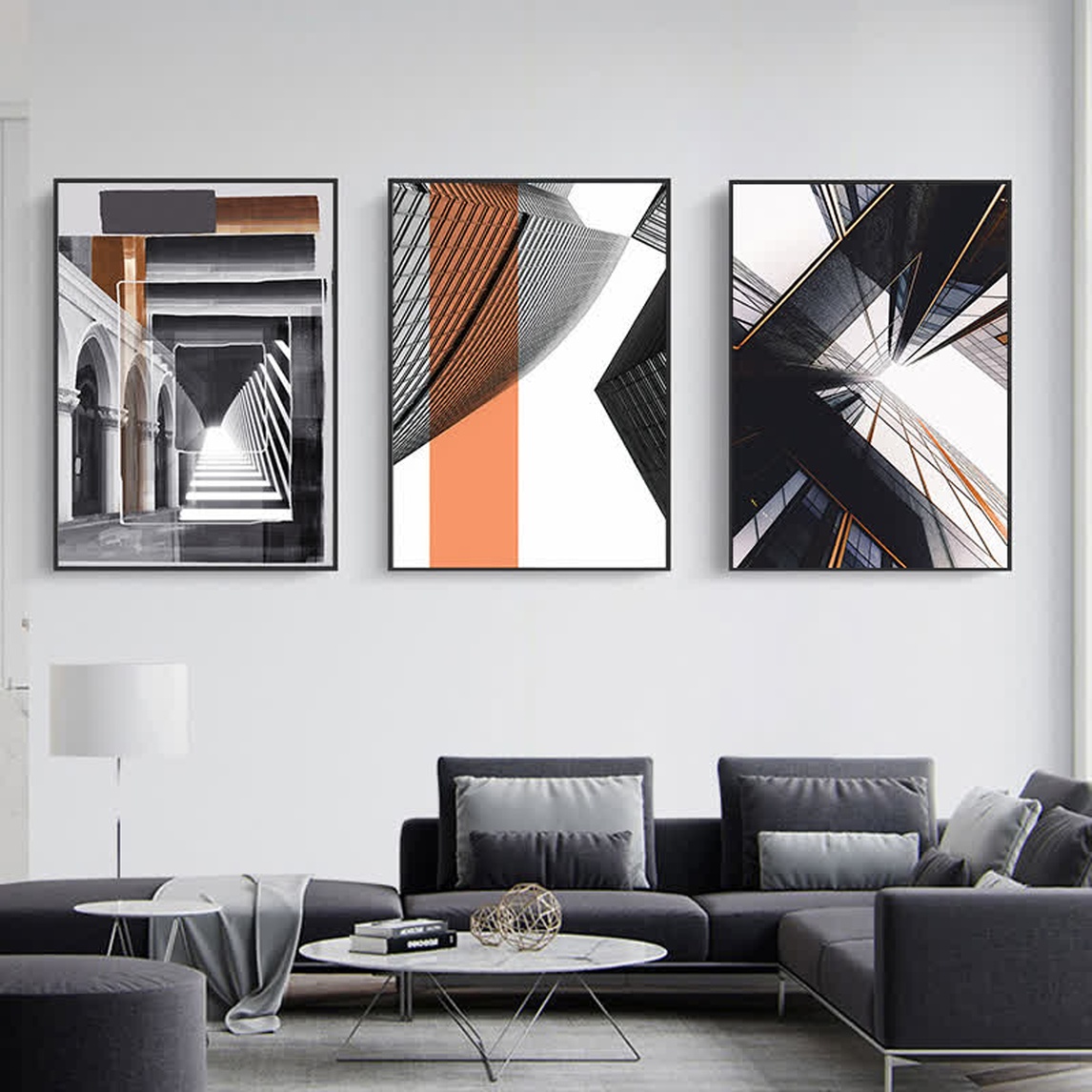 工业风设计,大多有点性冷淡的感觉,整个室内都为黑白灰,黑色沙发,白色简约茶几,再搭配颜色大胆的装饰画,简约中又显露着精致和大气。