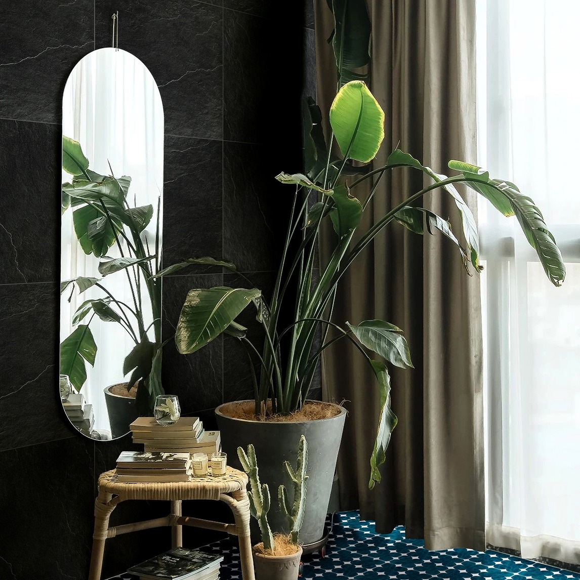 超黑天脉岩通体砖搭配复古小花砖,两者相得益彰,奠定了空间复古的主基调,再搭配壁挂椭圆镜子与大植物盆栽,无处不表达着张扬却不单调的浓浓复古风。
