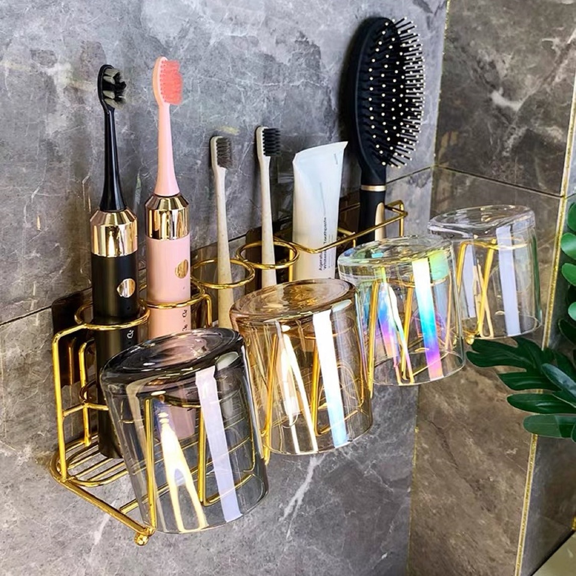无痕贴漱口杯置物架,高颜值,可承重20KG,电镀金边,防水防潮不生锈,杯子倒放,不留余水,让你健康生活每一天。